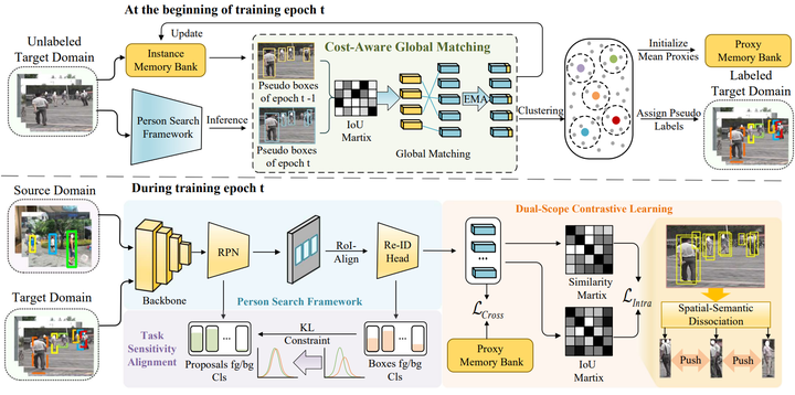 Domain-adaptive person search (DAPS) aims to transfer pedestrian detection and re-identification capabilities from a labeled source domain to an unlabeled target domain, yet faces critical challenges from domain shift: semantic confusion among overlapping instances, over-reliance on shallow features for look-alike targets, and poor discriminability of small-scale instances. To address these issues, we propose the Localization-Anchored Instance Discrimination (LAID) framework, which leverages spatial relationships between bounding boxes as auxiliary signals to enhance instance identity learning. LAID integrates three complementary strategies: 1) Cost-Aware Instance Matching (CAIM) uses IoUbased global optimal assignment to align current detections with historical identities, reducing overlap-induced misassociations; 2) Dual-Scope Contrastive Learning (DSCL) combines spatial separation constraints (for geometrically distant pairs) with global contrastive learning, prompting the model to learn deep discriminative features beyond superficial similarities; 3) Task-Sensitivity Alignment (TSA) aligns confidence distributions of detection and ReID heads via KL divergence, ensuring consistent pseudo-label generation. Extensive experiments on CUHK-SYSU and PRW atasets demonstrate that LAID outperforms state-of-the-art DAPS methods, validating its effectiveness in mitigating domain shift and narrowing the performance gap between supervised and domain adaptive person search.